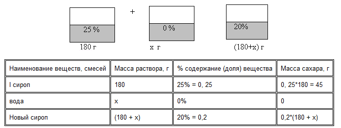 Сколько граммов воды надо добавить к 180 г сиропа,содержащего 25% сахара,чтобы получить сироп,концентрация которого равна 20%?