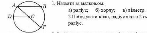 D 1. Назвати за малюнком: а) радіус; б) хорду; в) діаметр. 2. Побудувати коло, радіус якого 2 см. Побудувати радіус.