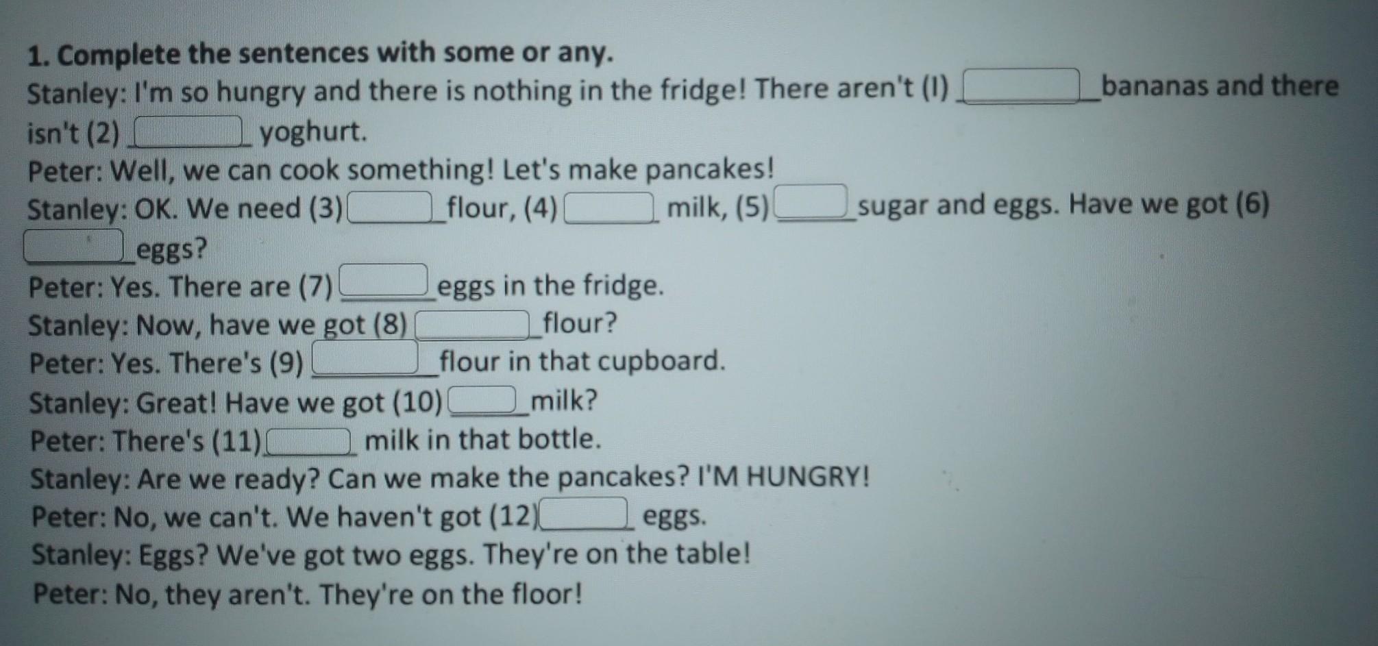 Stanley: OK. We need (3) some flour, (4) some milk, (5) some sugar and eggs. Have we got (6) any eggs? Peter: Yes. There are (7) some eggs in the fridge.