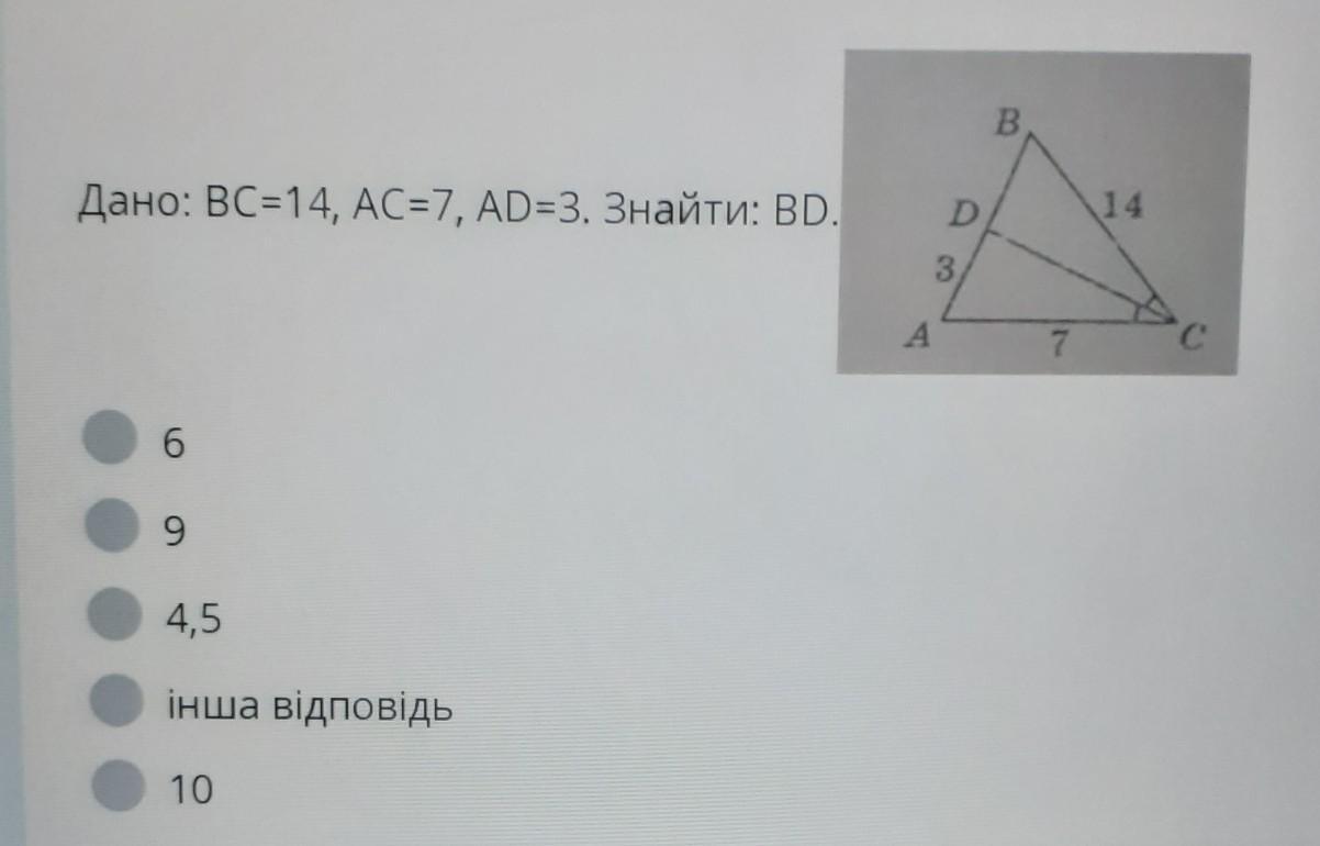 Дано: ВС=14, AC=7, AD=3. СD - бісектриса ∠С