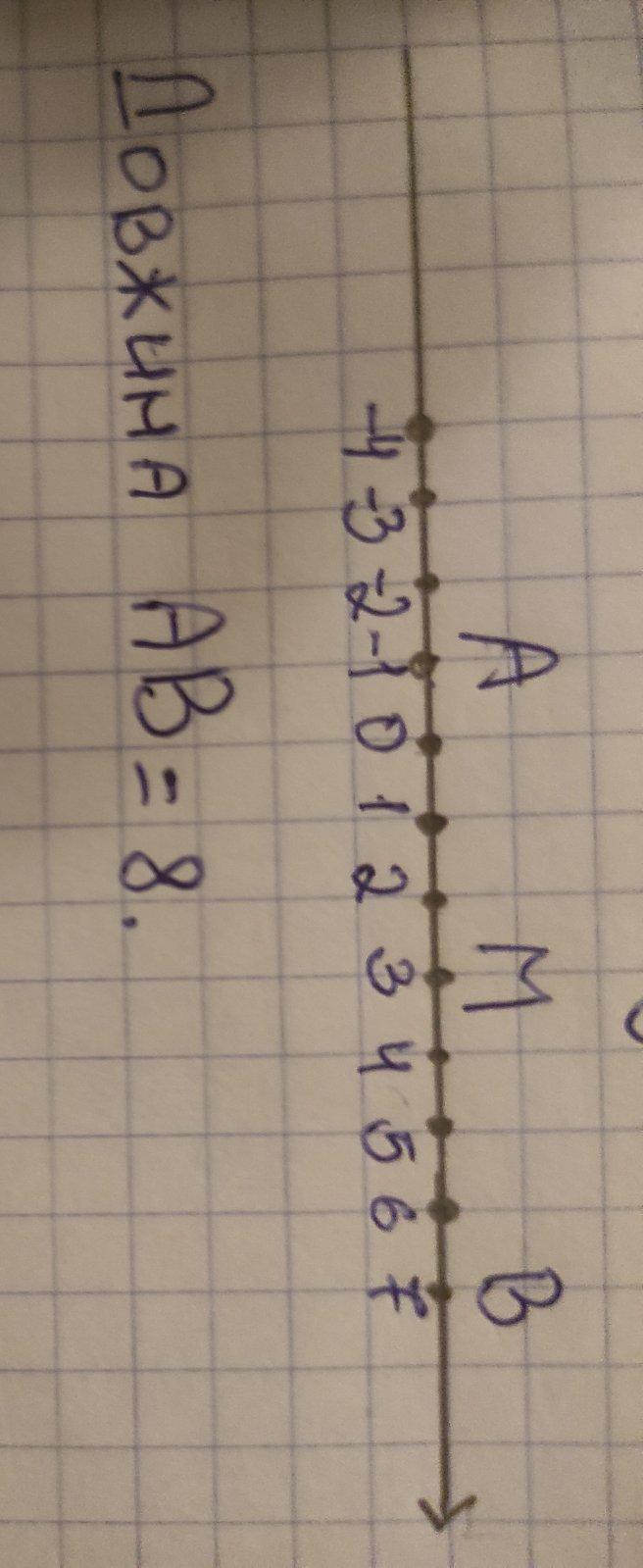 6. Побудуйте координатну пряму. Позначте на ній точку М (3). Знайдіть координати точок А і В, віддалених від точки М на 4 одиниці. Знайдіть довжину відрізка AB