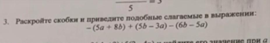 5 3. Раскройте скобки и приведите подобные слагаемые в выражении: - (5a + 8b) + (Sb - 3a) - (6b - 5a)