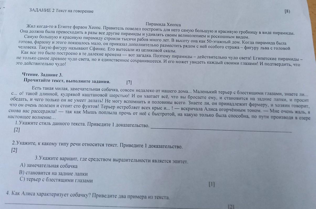 Чтение. Задание 3. Прочитайте текст, выполните задания. 171 Есть такая милая, замечательная собачка, совсем недалеко от нашего дома... Маленький терьер с блестящими с о! такой длинной, кудрявой каштановой шерстью! И он хватает все, что вы бросаете ему, и становится на зад обедать, и чего только он не умеет делать! Не могу вспомнить и половины всего. Знаете ли, он принадлежит ферме что он очень полезен и стоит сто фунтов! Терьер истребляет всех крыс и... ! - вскричала Алиса снова вас рассердила! - так как Мышь поплыла прочь от нее с быстротой, на какую только была способна, по п настоящее волнение... огорченным тоном. 1. Укажите стиль данного текста. Приведите 1 доказательство. [2] 2. Укажите, к какому типу речи относится текст. Приведите 1 доказательство. [2] 3. Укажите вариант, где средством выразительности является эпитет. А) замечательная собачка В) становится на задние лапки C) Tepbep с блестящими глазами 4. Как Алиса характеризует собачку? Приведите два примера из текста. [1] [2]