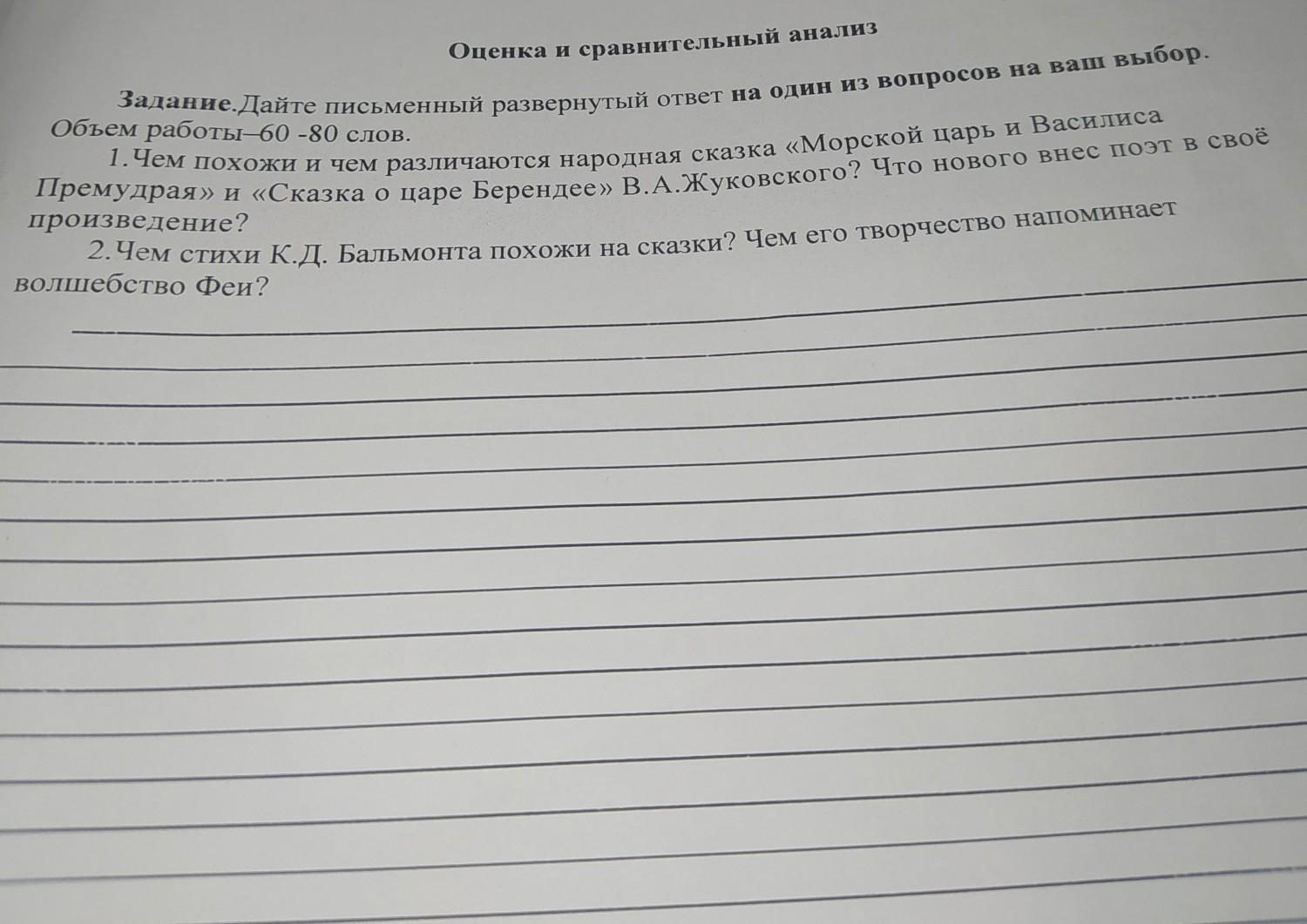 Оценка и сравнительный анализ Обьем работы 60-80 слов. Задание.Дайте письменный развернутый ответ на один из вопросов на ваш выбор. 1.Чем похожи и чем различаются народная сказка «Морской царь и Василиса Премудрая» и «Сказка о царе Берендее» В.А.Жуковского? Что нового внес поэт в своё 2. Чем стихи К.Д. Бальмонта похожи на сказки? Чем его творчество напоминает произведение? волшебство Феи?