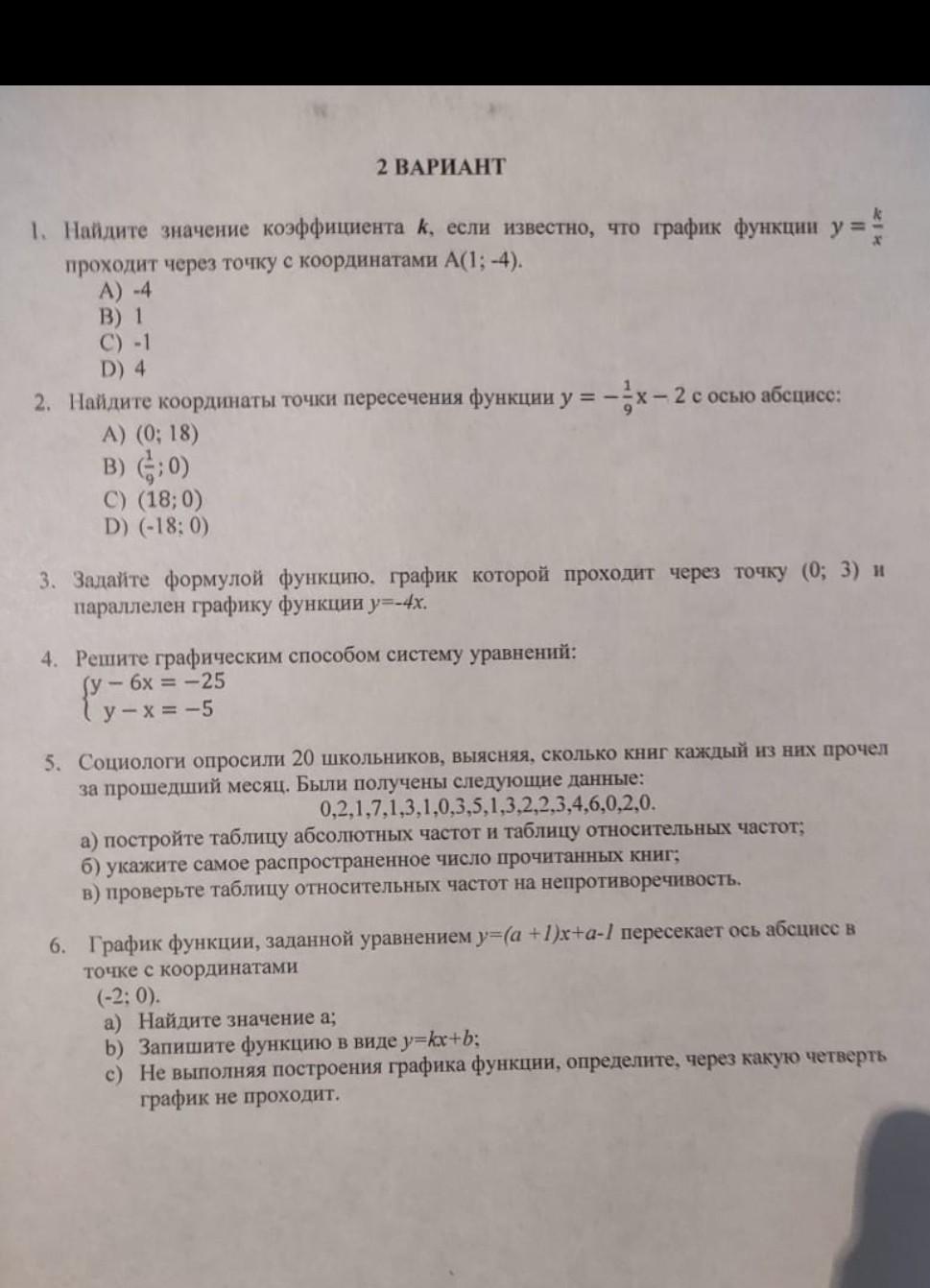 2. Найдите координаты точки пересечения функции у = -3 x - 2 с осью абсцисс: A) (0; 18) В) (4:0) c) (18; 0) D) (-18; 0)