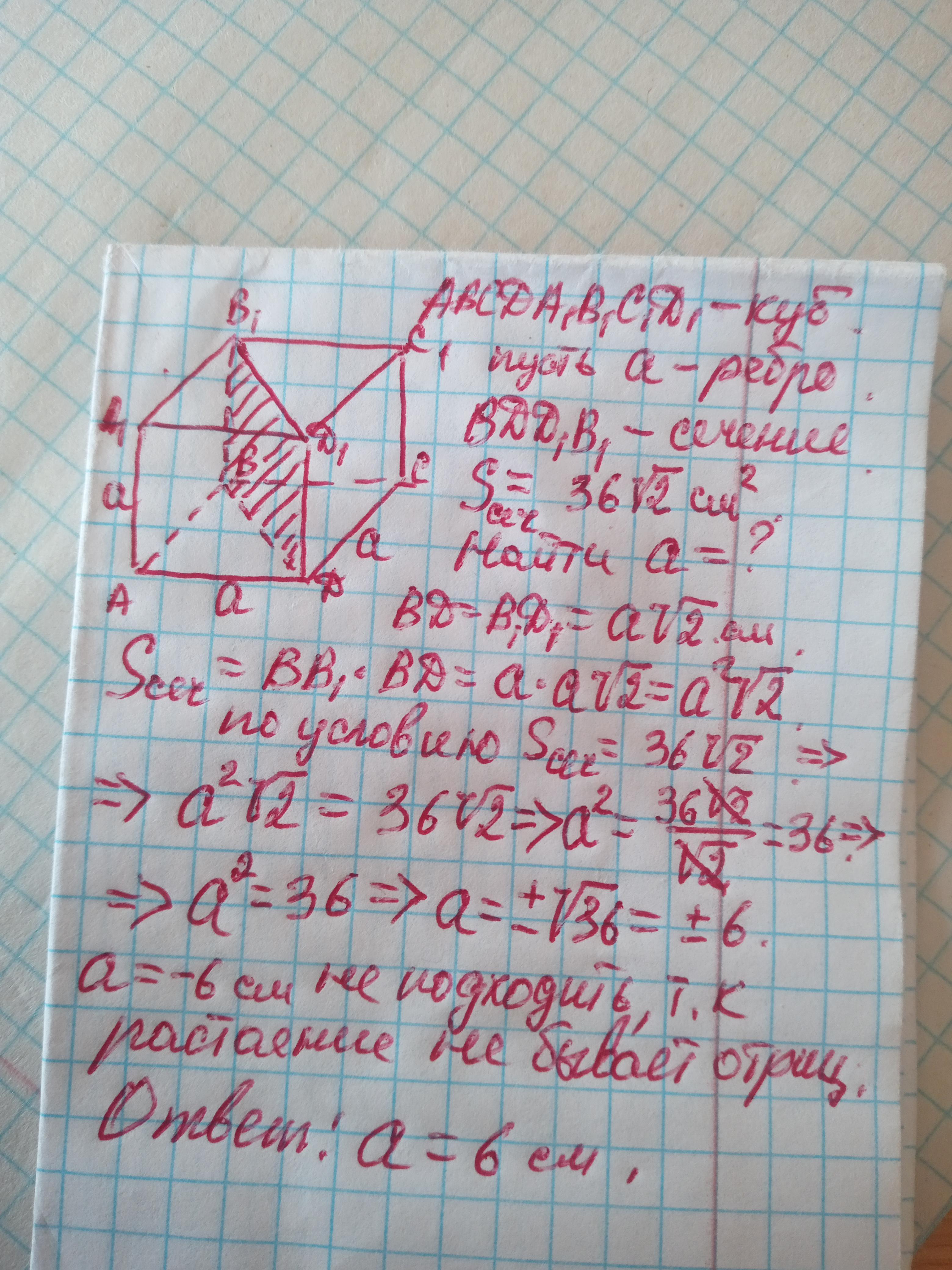 Площадь сечения проведенного через диагонали двух противоположных граней куба, равна 36√2 см^2. вычислить ребро куба.