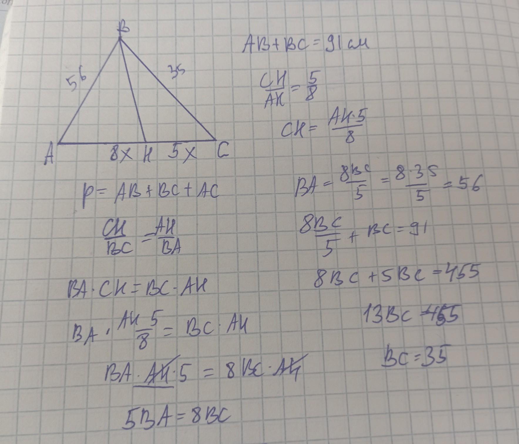 8. В треугольнике ABC сумма сторон AB и BC равна 91 см, а биссектриса ВН угла между ними делит третью сторону в отношении 5:8. Найдите стороны АВ и ВС треугольника.