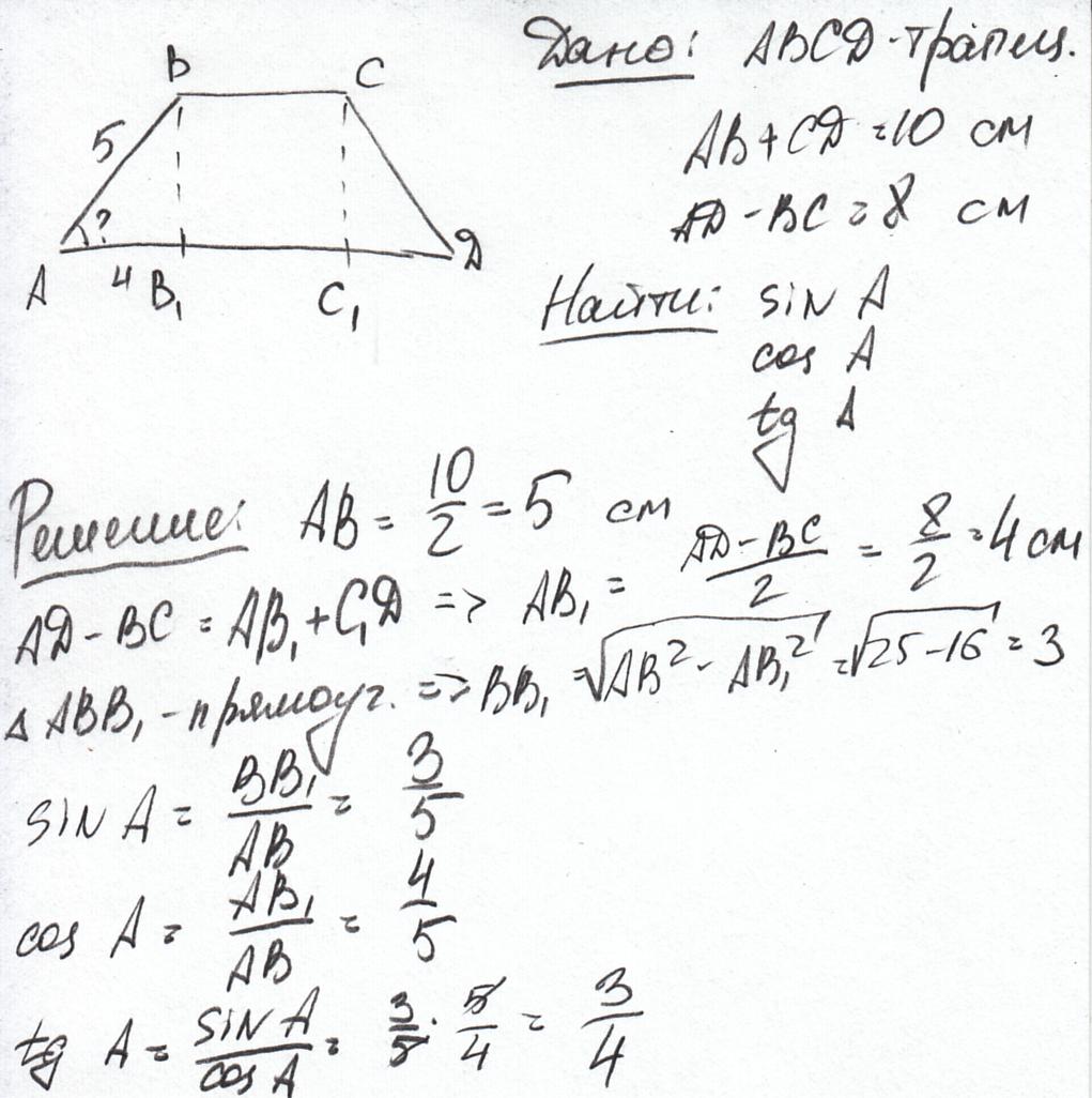 Найдите синус, косинус и тангенс острого угла равно бедренной трапеции, разность оснований которой равна 8 см, а сумма боковых - 10 см