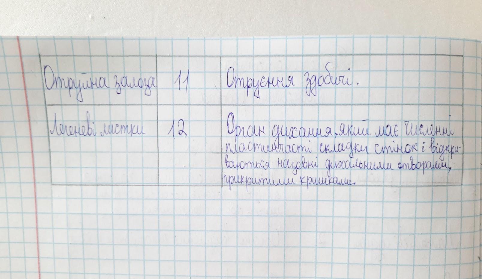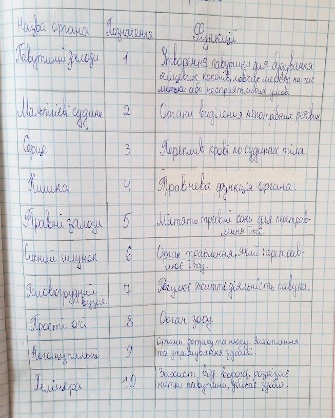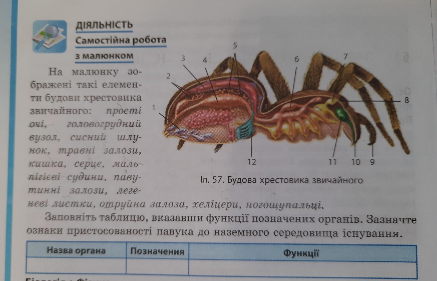 Заповніть таблицю, вказавши функції позначених органів. Зазначте ознаки пристосованості павука до наземного середовища існування.