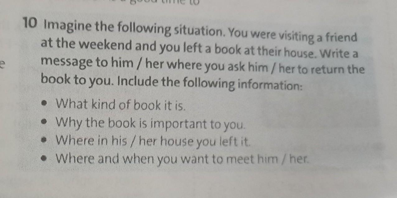 he 10 Imagine the following situation. You were visiting a friend at the weekend and you left a book at their house. Write a message to him/her where you ask him/her to return the book to you. Include the following information: • What kind of book it is. • Why the book is important to you. • Where in his/her house you left it. • Where and when you want to meet him/her.