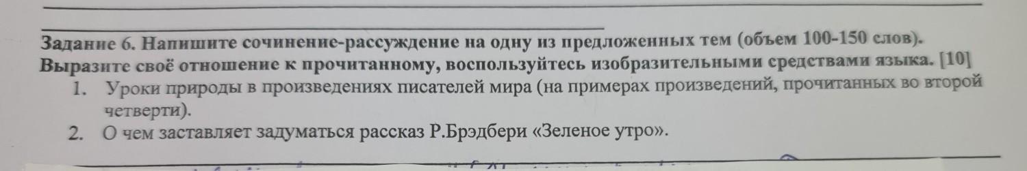 Задание 6. Напишите сочинение-рассуждение на одну из предложенных тем (обьем 100-150 слов). Выразите своё отношение к прочитанному, воспользуйтесь изобразительными средствами языка. [10] 1. Уроки природы в произведениях писателей мира (на примерах произведений, прочитанных во второй четверти). 2. О чем заставляет задуматься рассказ Р.Брэдбери «Зеленое утро».