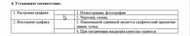 4. Установите соответствие. 1. Растровая графика 2. Векторная графика 1. Иллюстрации, фотографии 2. Чертежи, схемы 3. Наименьшей единицей является графический примитив- линия, точка. 4. При увеличении масштаба качество теряется