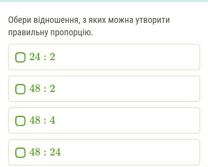 Обери відношення, з яких можна утворити правильну пропорцію. 024:2 ( 48 : 2 | 48 : 4 048:24. ПОМОГИТЕ ПОЖАЛУЙСТА