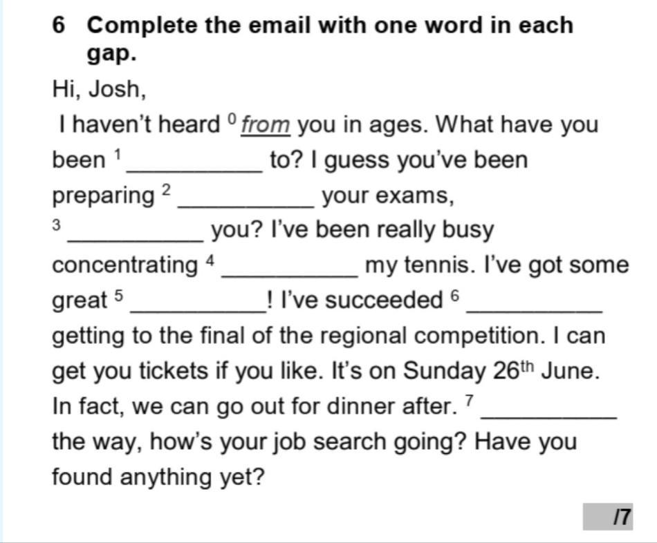been up to? I guess you've been preparing for your exams, right? I've been really busy concentrating on my tennis. I've got some great news! I've succeeded in getting to the final of the regional competition. I can get your tickets if you like. It's on Sunday 26th June. In fact, we can go out for dinner after. By the way, how's your job search going? Have you found anything yet?