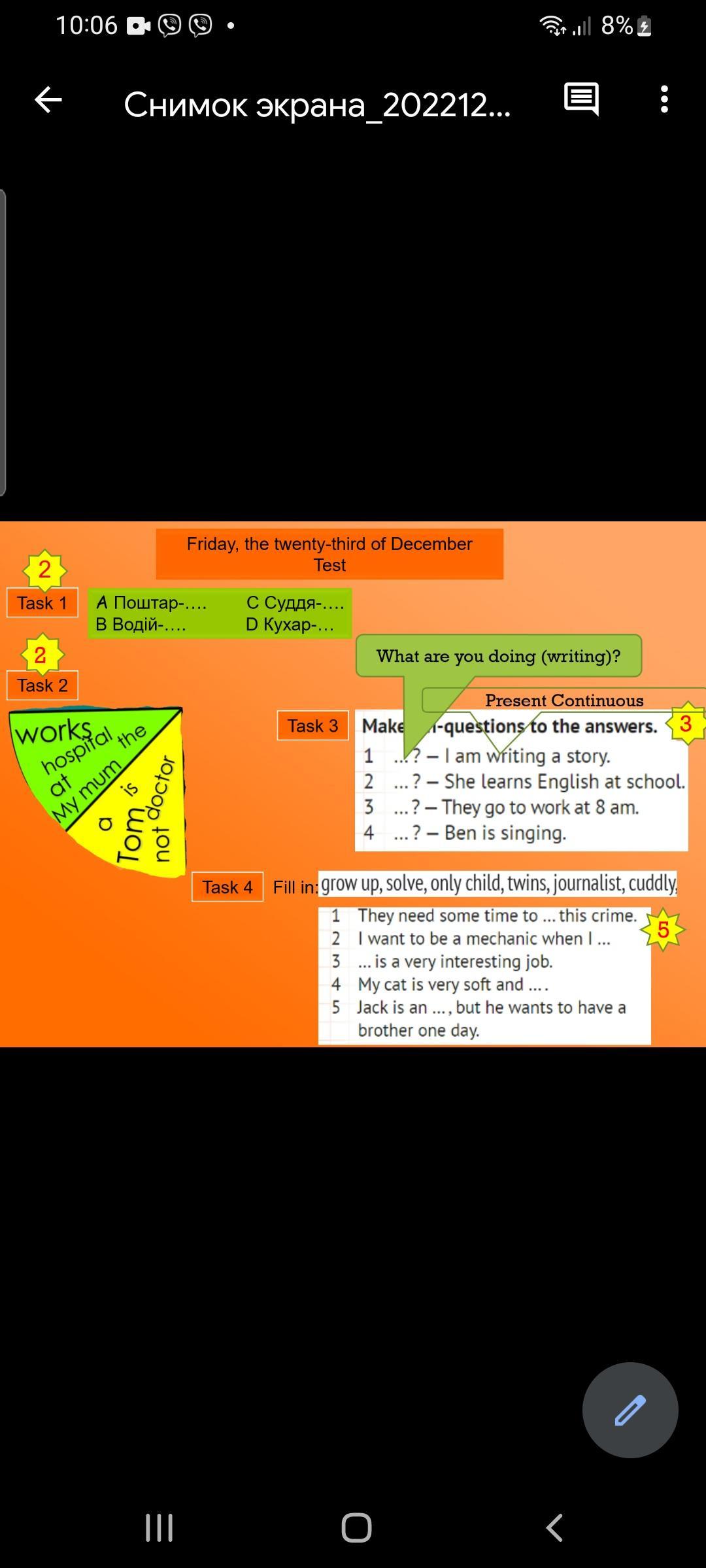 1) Postman. 2) Driver 3) Judge 4) Cook(не пам'ятаю як точно)