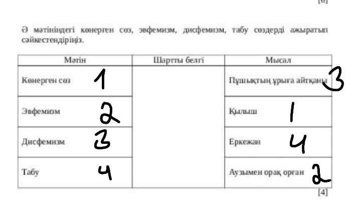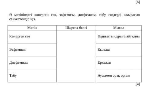 Ә мәтiнiндегi көнерген сөз, эвфемизм, дисфемизм, табу сөздерді ажыратып сәйкестендіріңіз. Шартты белгi Көнерген сөз Эвфемизм Матiн Дисфемизм Табу кылыш Мысал Пушықтың ұрыға айтқаны Еркежан [6] Аузымен орак орган [4] помагиииитееее