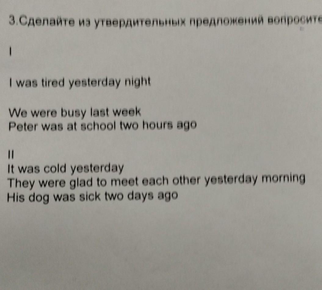 3.Сделайте из утвердительных предложений вопросительные 1 I was tired yesterday night We were busy last week Peter was at school two hours ago 11 It was cold yesterday They were glad to meet each other yesterday morning His dog was sick two days ago