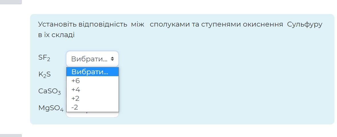 Установіть відповідність між сполуками та ступенями окиснення Сульфуру в їх складі
