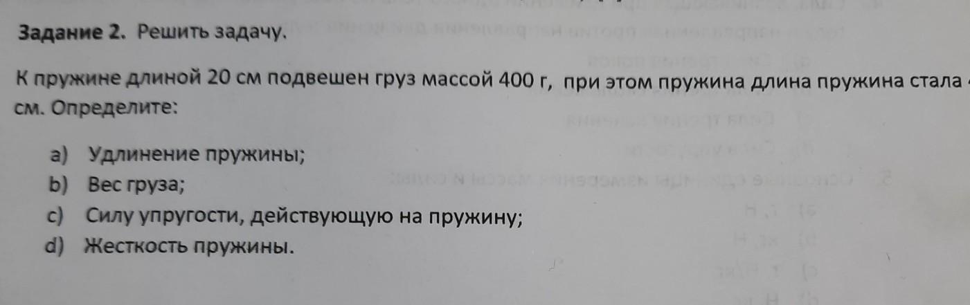 Задание 2. Решить задачу. К пружине длиной 20 см подвешен груз массой 400 г, при этом пружина длина пружина стала 40 см. Определите: а) Удлинение пружины; b) Вес груза; с) Силу упругости, действующую на пружину; d) Жесткость пружины.