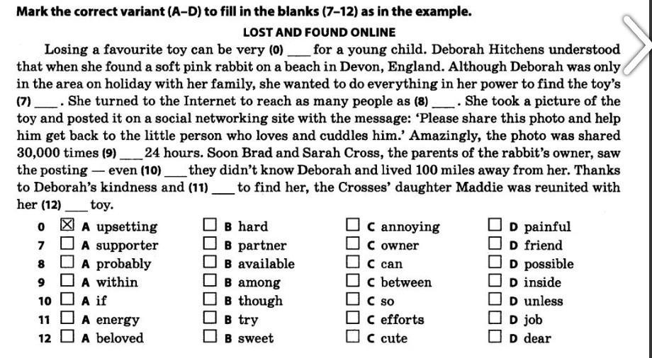 Mark the correct variant (A-D) to fill in the blanks (7-12) as in the example. LOST AND FOUND ONLINE Losing a favourite toy can be very (0) for a young child. Deborah Hitchens understood that when she found a soft pink rabbit on a beach in Devon, England. Although Deborah was only in the area on holiday with her family, she wanted to do everything in her power to find the toy's (7). She turned to the Internet to reach as many people as (8). She took a picture of the toy and posted it on a social networking site with the message: 'Please share this photo and help him get back to the little person who loves and cuddles him.' Amazingly, the photo was shared 30,000 times (9)____24 hours. Soon Brad and Sarah Cross, the parents of the rabbit's owner, saw the posting - even (10), they didn't know Deborah and lived 100 miles away from her. Thanks to find her, the Crosses' daughter Maddie was reunited with to Deborah's kindness and (11) her (12) toy. A upsetting A supporter A probably A within A if A energy A beloved 0 7 8 9 10 11 12 0000000 B hard B partner B available B among B though B try B sweet cannoying C owner C can c between C so c efforts c cute ☐D painful D friend D possible D inside D unless D job D dear