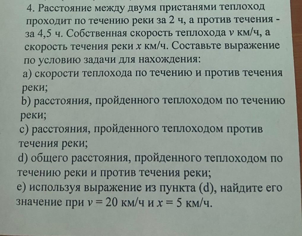 4. Расстояние между двумя пристанями теплоход проходит по течению реки за 2 ч, а против течения за 4,5 ч. Собственная скорость теплохода у км/ч, а скорость течения реки х км/ч. Составьте выражение по условию задачи для нахождения: а) скорости теплохода по течению и против течения реки; b) расстояния, пройденного теплоходом по течению реки; с) расстояния, пройденного теплоходом против течения реки; d) общего расстояния, пройденного теплоходом по течению реки и против течения реки; e) используя выражение из пункта (d), найдите его значение при v = 20 км/ч и х = 5 км/ч. -