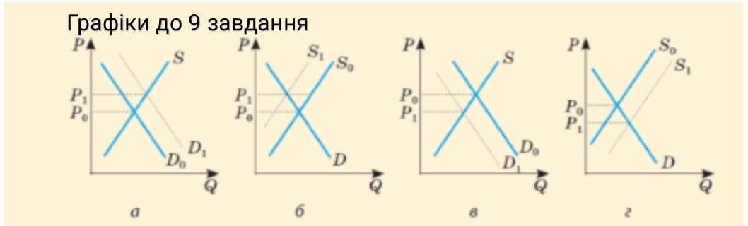 9. Встановіть відповідність між графічним відображенням порушення ринкової рівноваги та їх тлумаченнями: