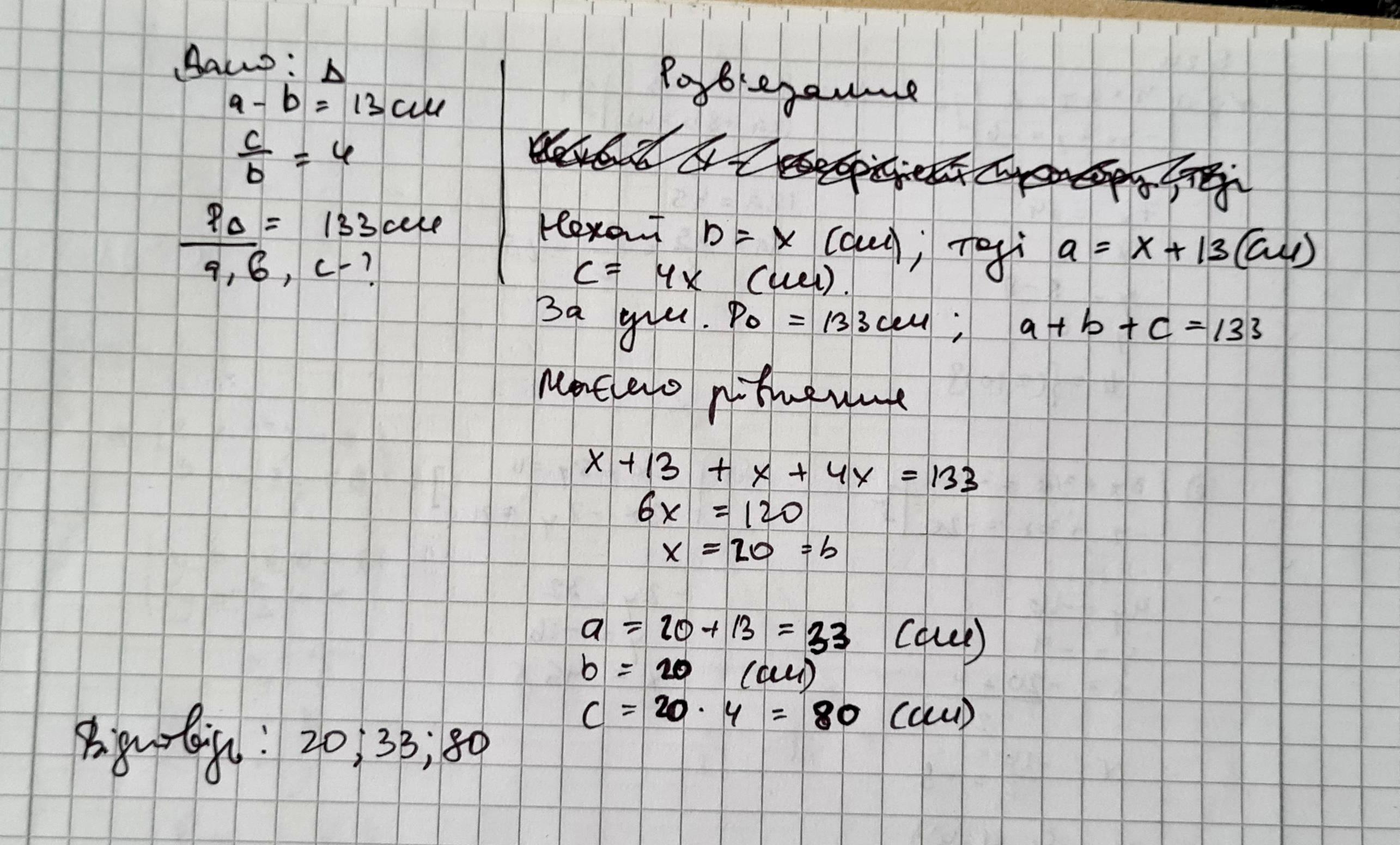 Одна із сторін трикутника на 13 см менша від другої, та у 4 рази менше від третьої. Знайдіть сторони трикутника, якщо його периметр дорівнює 133 см. ( у відповідь записати сторони через крапку з комою , у порядку зростання , без найменування )