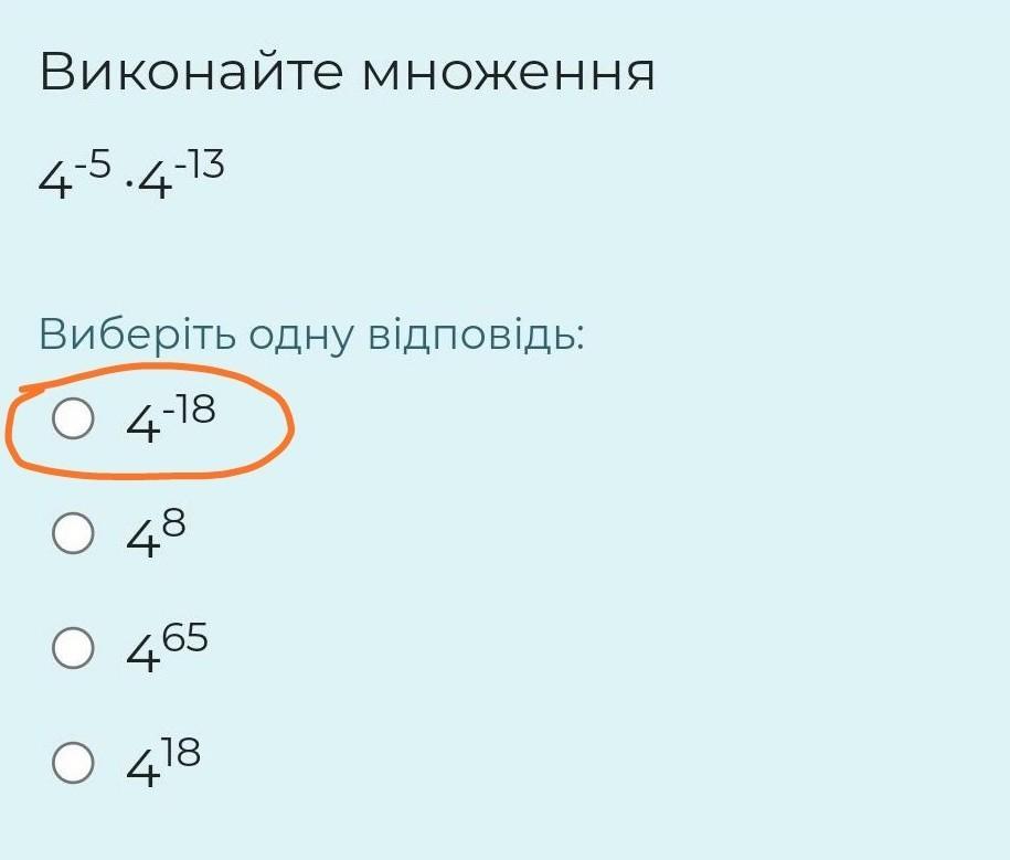 4-⁵ * 4-¹³ = 4^(-5 + (-13)) = 4^(-5-13) = 4-¹⁸