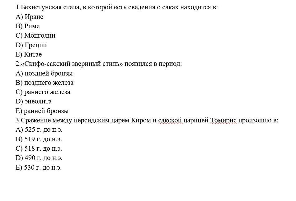 Ответ: 1. А) Иране, 2. С) раннего железа, 3. Е) 530 г. до н. э.
