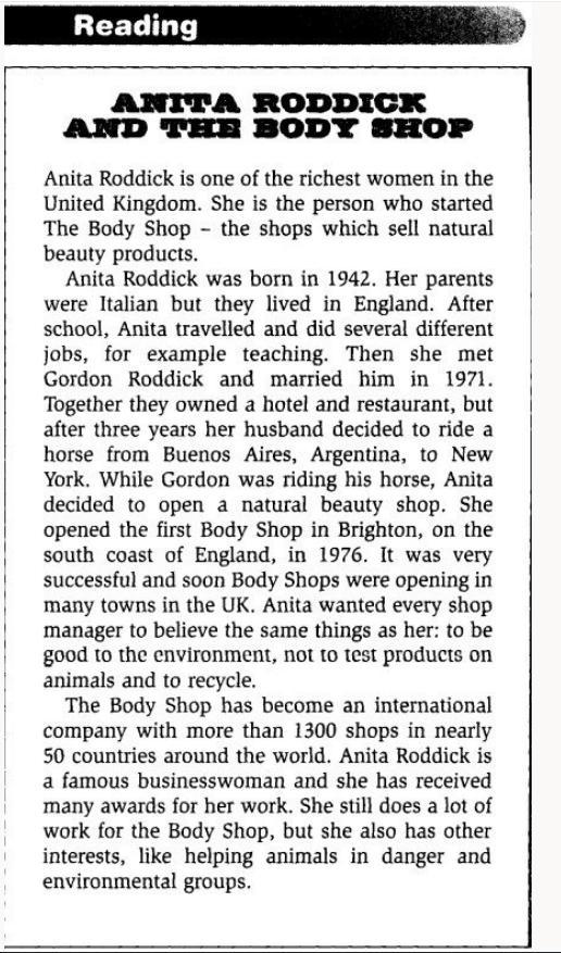 1.Anita Roddick was born in Italy(Баллов: 1)