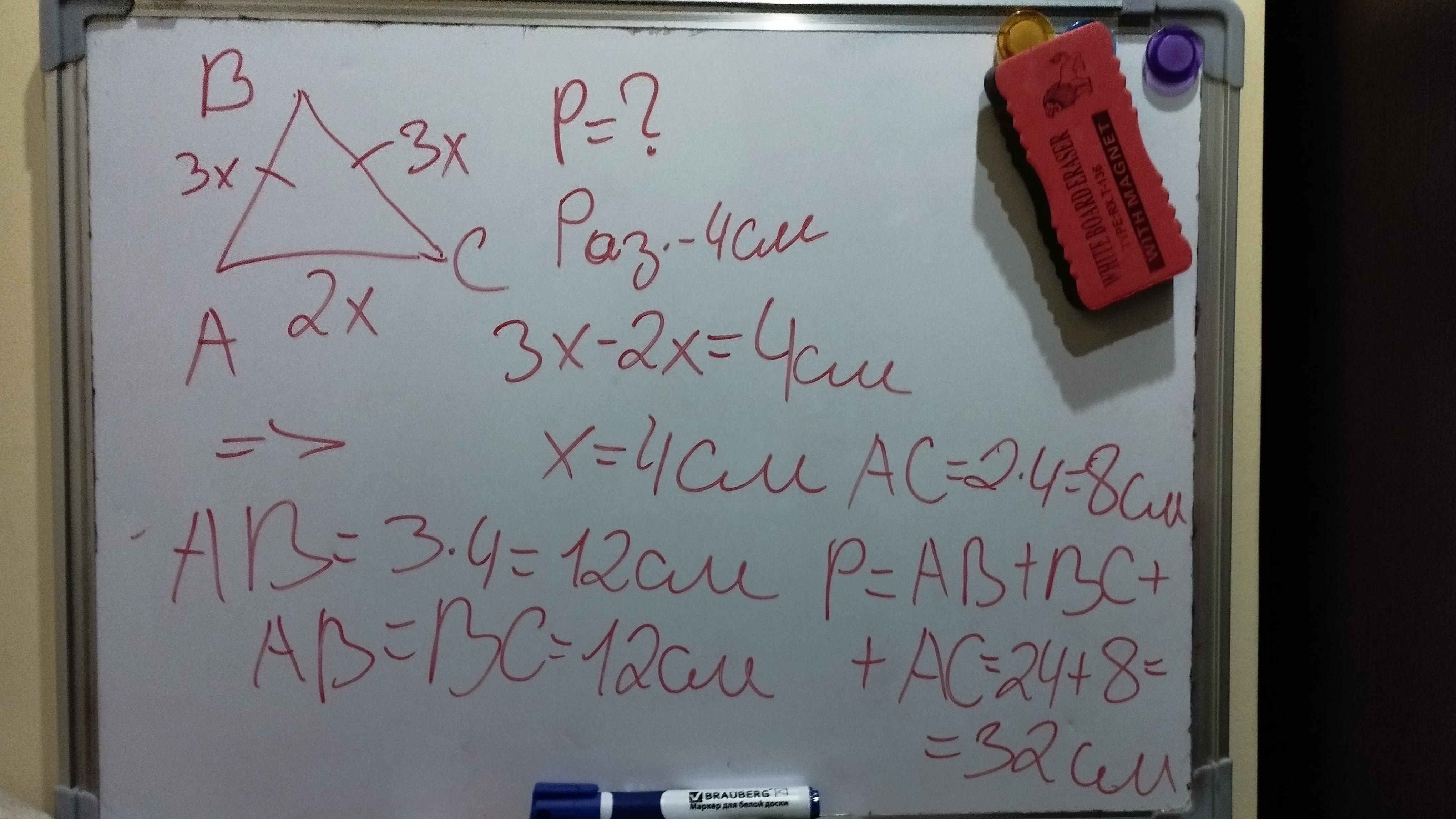 в равнобедренном треугольнике боковая сторона относится к основанию как 3:2,а их разность равна 4 см.найдите периметр треугольника.