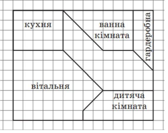 Проаналізуйте план квартири, враховуючи, що на малюнку одна клітинка дорівнює 1м2. Дайте відповіді на наступні запитання: 1) Знайдіть площу кухні. 2) Знайдіть площу вітальні. 3) Знайдіть площу дитячої кімнати. 4) Знайдіть площу гардеробної. 5) Скільки кахлів потрібно на підлогу у ванну кімнату, якщо кахлева плитка має розміри 25 см Х 20 см?