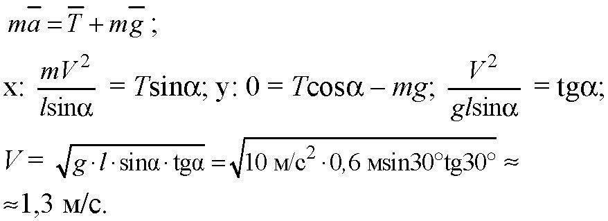 Груз, подвешенный на веревке длиной 60 см, движется равномерно и совершает в горизонтальной плоскости круг. Если при движении канат составляет с вертикальной плоскостью постоянный угол 30°, с какой скоростью двигался груз?