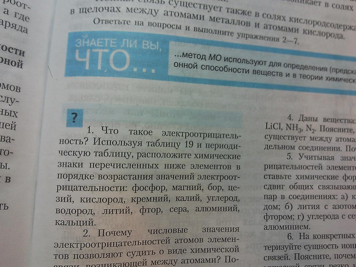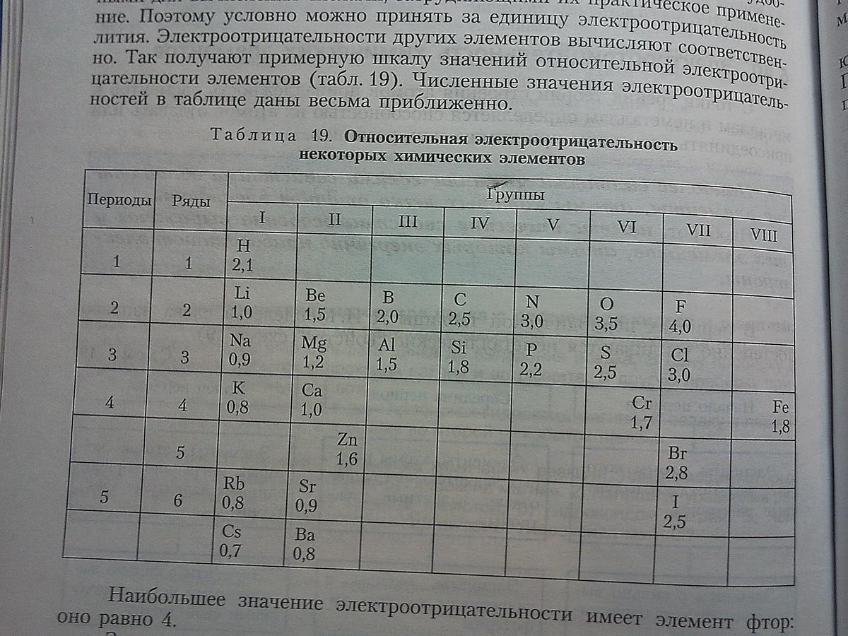 Cs (0,7), K (0,8), Li (0,98), Ca (1,0), Mg (1,2), Al (1,5), Si (1,8), B (2,0), H (2,1), P (2,2), C (2,55), S (2,58), O (3,5), F (4,0)