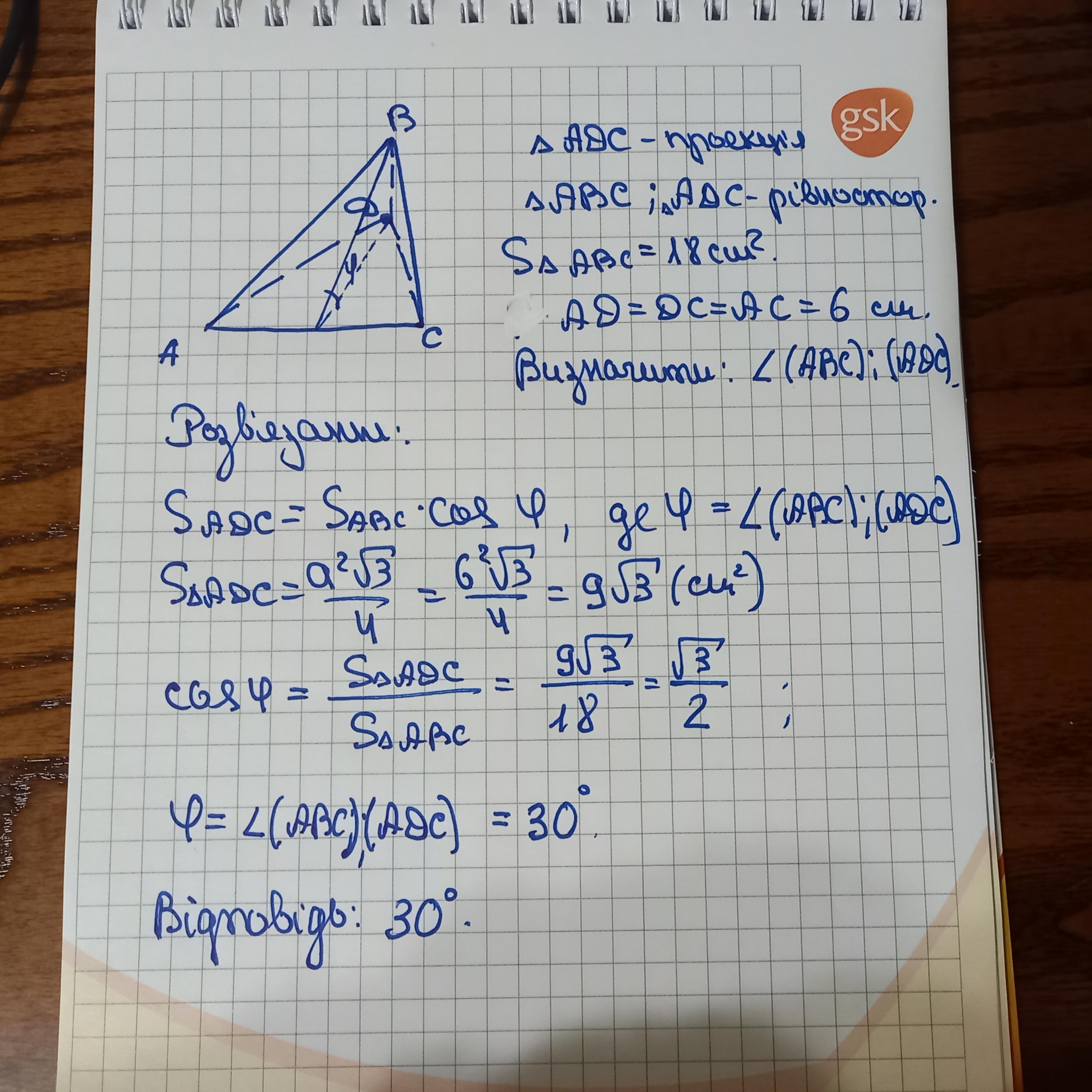 Ортогональною проекцією трикутника, площа якого дорівнює 18см2, є рівносторонній трикутник зі стороною 6см. Визначте градусов міру куда між площинами трикутників