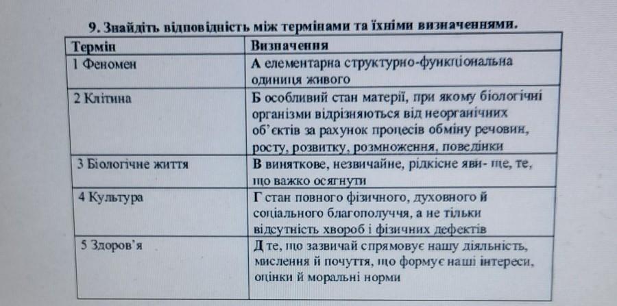 9. Знайдіть відповідність між термінами та їхніми визначеннями. Термін Визначення 1 Феномен А елементарна структурно-функціональна 2 Клітина 3 Бiологiчне життя 4 Культура 5 Здоров'я одиниця живого Б особливий стан матерiї, при якому біологічні організми відрізняються від неорганічних об'єктiв за рахунок процесів обміну речовин, РОС ТУ. РОЗВитку, розмноження. поведнки В виняткове, незвичайне, рідкісне яви-ще, те, що важко осягнути Г стан повного фізичного, духовного й соціального благополуччя, а не тільки вiдсутність хвороб і фізичних дефектів Д те, що зазвичай спрямовує нашу діяльність, мислення й почуття, що формує нашi iнтереси, оцінки й моральні норми