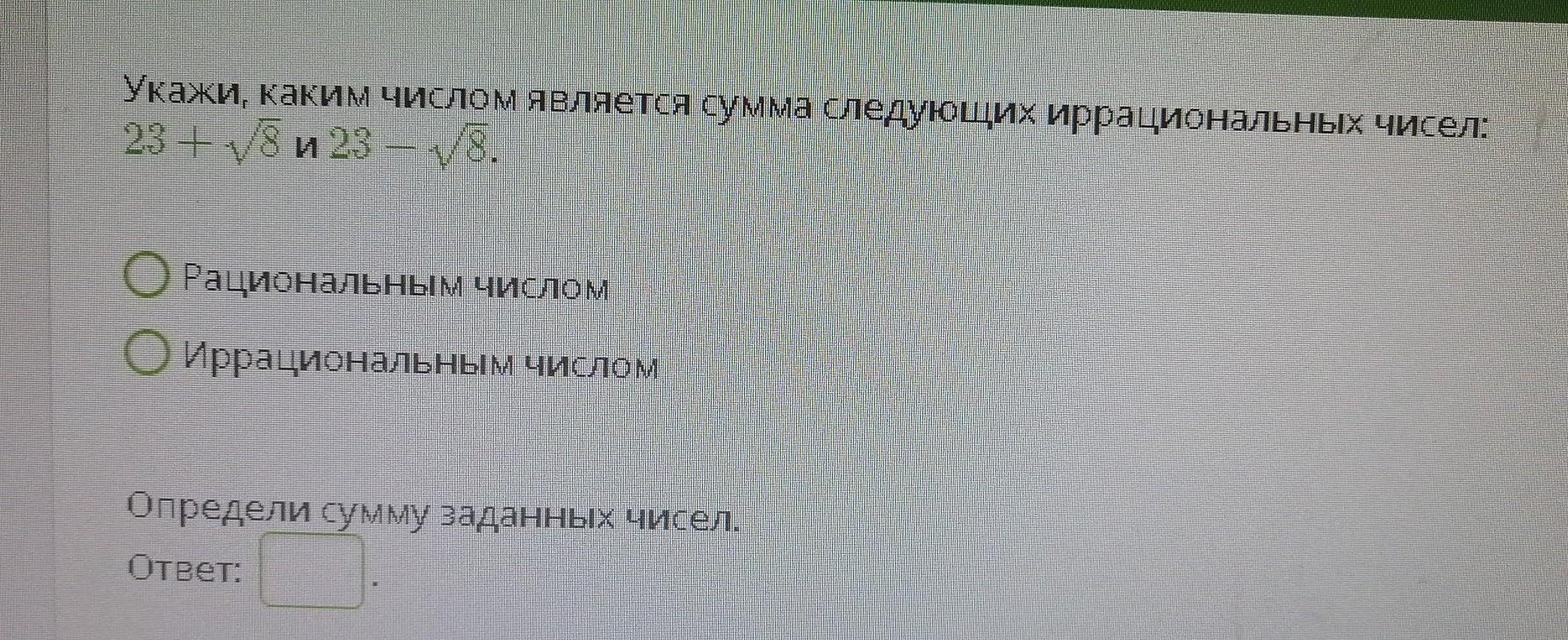 23+√8 +23 -√8 => +√8 и -√8 взаимно уничтожаются и сумма равна нулю =>23+23+(√8-√8)=23+23=46 число рациональное => 46/1!!!