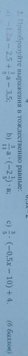 2. Преобразуйте выражения в тождественно равные: 3 a) -1.23-2,5 +-a-3,5; b) та (-23). B; 0,5x-2 c) (-0,5x - 10) + 4.