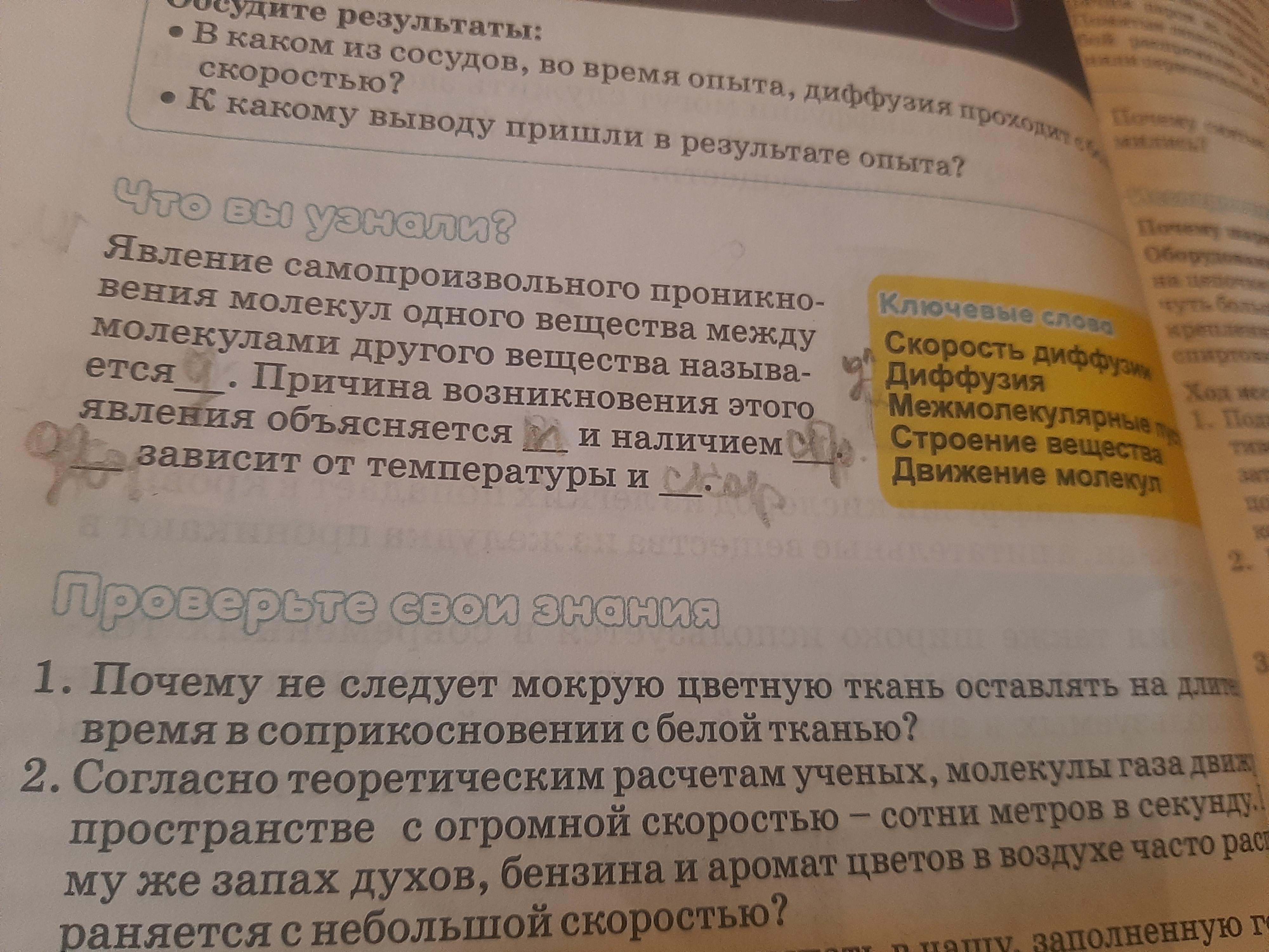 ..диффузией. ...движением молекул и наличием межмолекулярных промежутков. Скорость диффузии ....... строения вещества.