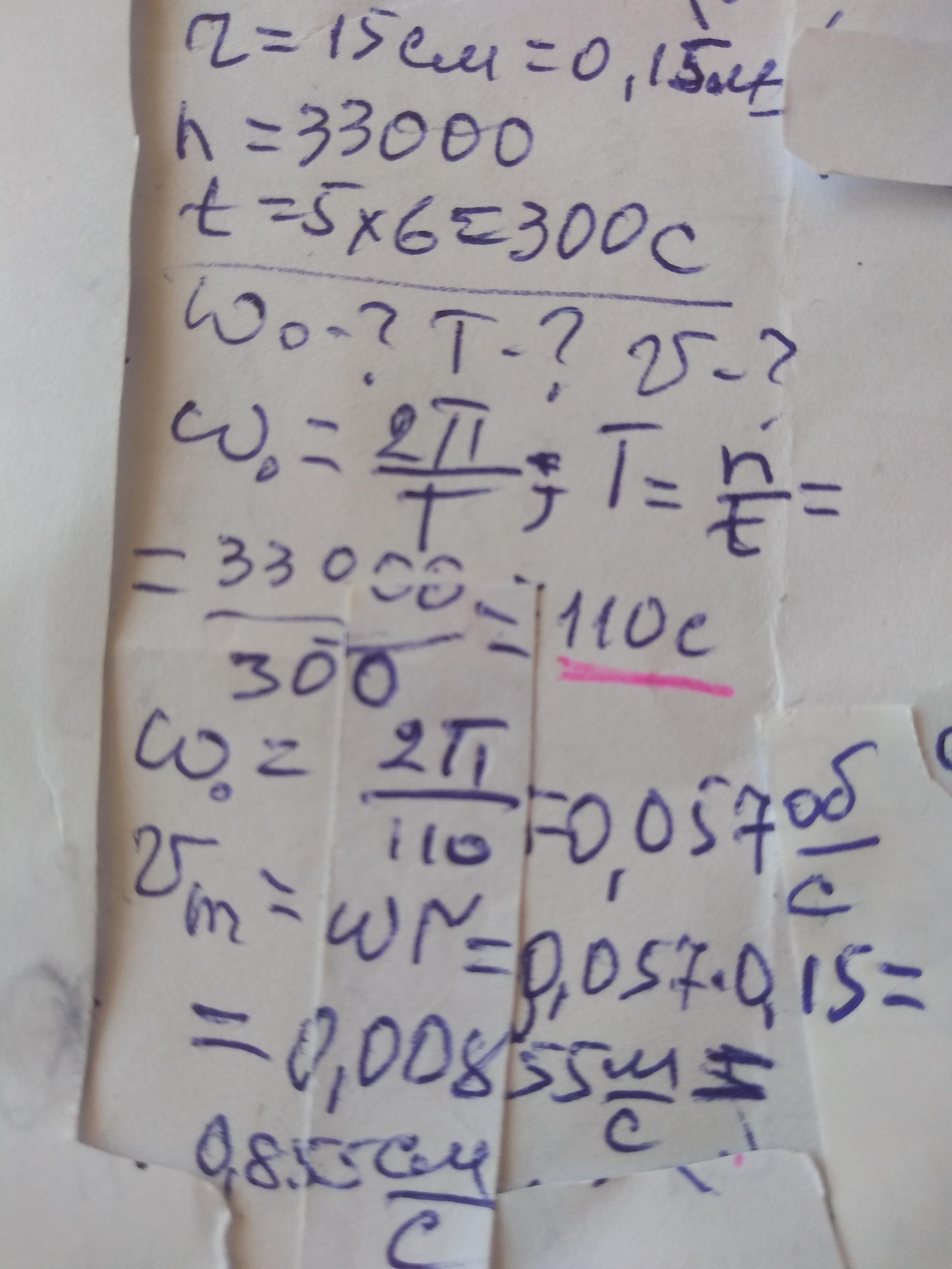Шків двигуна радіусом 15 см робить 33000 за 5 хв точок. Визначити обертову частоту, період обертання і лінійну швидкість точок, що лежать на ободі шківа