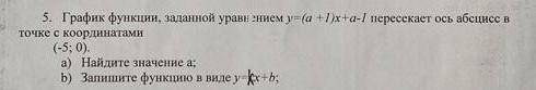 5. График функции, заданной уравнением у=(а +1)х+а-1 пересекает ось абсцисс в точке с координатами (-5; 0). а) Найдите значение а; b) Запишите функцию в виде у=х+b;
