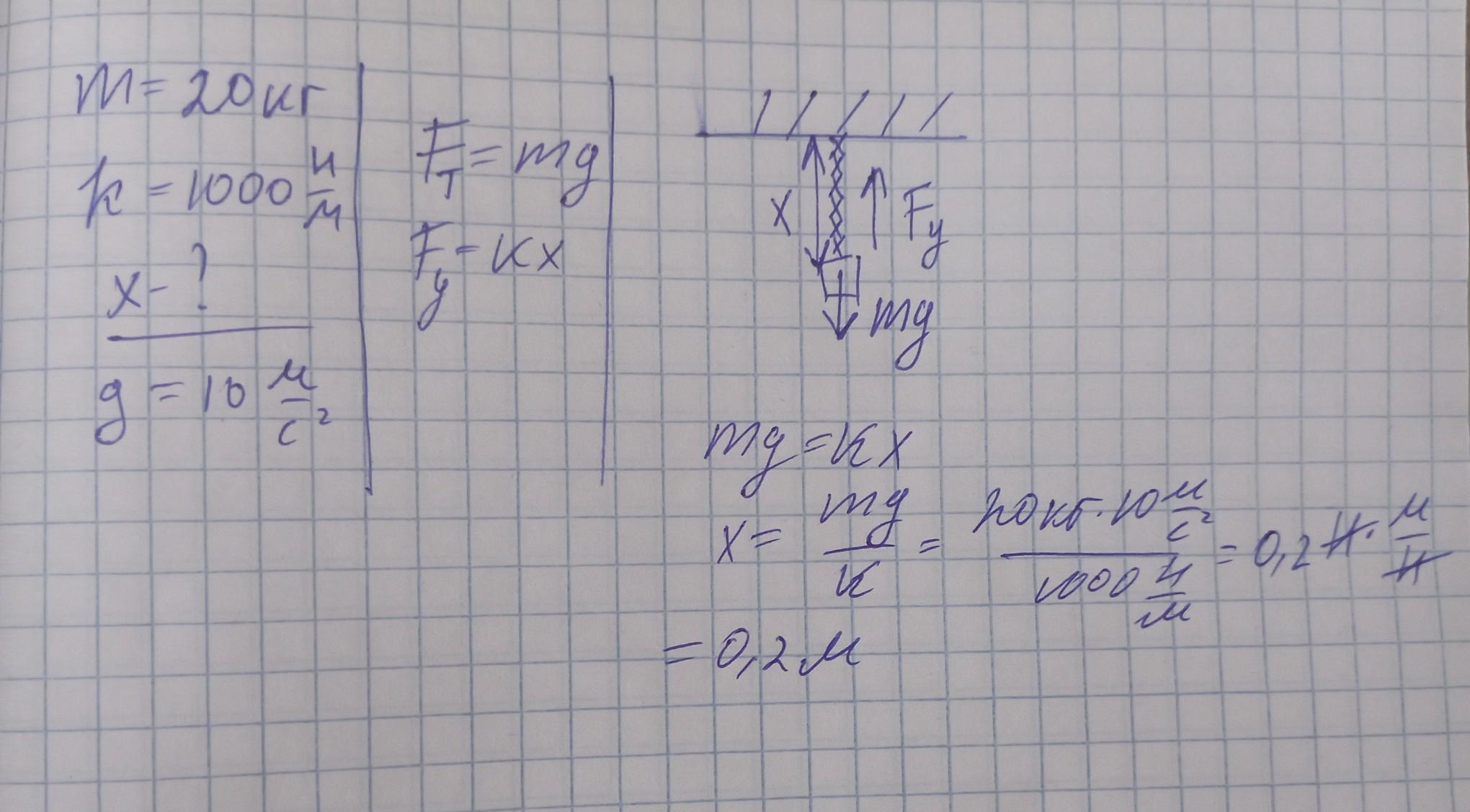 Δx = F / k = m·g / k = 20·10 / 1000 = 0.2 м