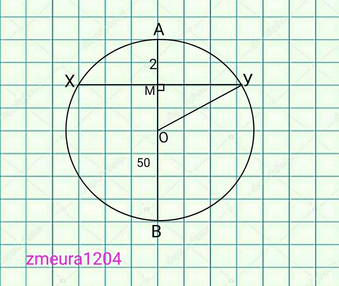 Хорда XY кола, яка перпендикулярна до діаметра AB, перетинає його у точці M і ділить на відрізки 2 см і 50 см. Знайти довжину хорди XY