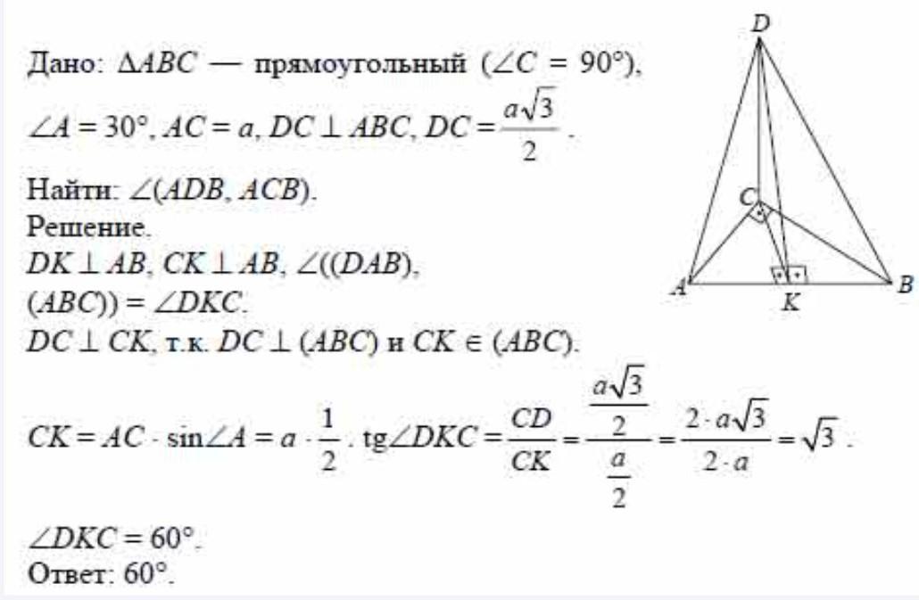 Дан прямоугольный треугольник ABC, угол С = 90 градусов, угол А = 30 градусов, АС = 2, DC Ʇ ABC, DC = корень из 3. Чему равен угол между плоскостями ADB и АСВ? Пожалуйста, можно с рисуном.