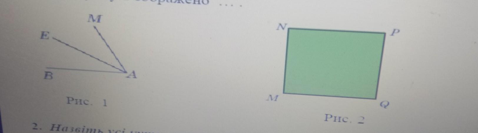 1. Продовжити речення: А) Градусна міра розгорнутого кута дорівнює Б) Для вимірювання кутів використовують спеціальний прилад В) на рисунку 1 сторони кута Г) на рисунку 2 зображено 2 Рис.