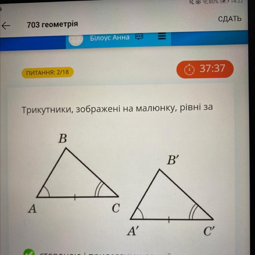 Трикутники, зображені на малюнку, рівні за 2 ознакою рівності трикутників.