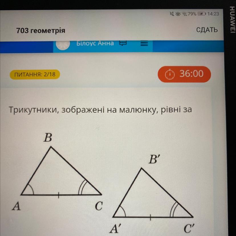 якщо сторона і два прилеглі до неї кути одного трикутника відповідно дорівнюють стороні та двом прилеглим до неї кутам іншого трикутника то такі кути рівні(друга ознака рівності трикутників)