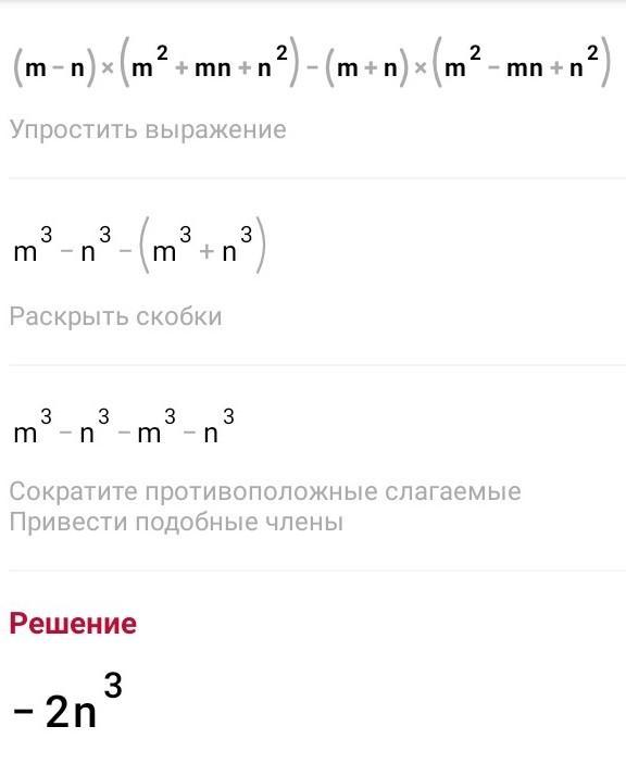 (m-n) x (m²+mn+n²) - (m+n)x(m²-mn +n²)=m³- n³- (m³+n³)=m³-n³-m³-n³= -2n³