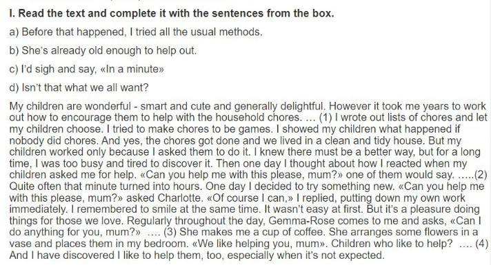 I. Read the text and complete it with the sentences from the box. a) Before that happened, I tried all the usual methods. b) She's already old enough to help out. c) I'd sigh and say, d) Isn't that what we all want? My children are wonderful - smart and cute and generally delightful. However it took me years to work out how to encourage them to help with the household chores.... (1) I wrote out lists of chores and let my children choose. I tried to make chores to be games. I showed my children what happened if nobody did chores. And yes, the chores got done and we lived in a clean and tidy house. But my children worked only because I asked them to do it. I knew there must be a better way, but for a long time, I was too busy and tired to discover it. Then one day I thought about how I reacted when my children asked me for help. . Children who like to help?.... (4) And I have discovered I like to help them, too, especially when it's not expected.