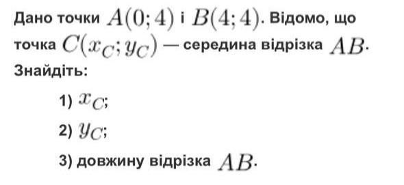 Пояснення: Xc=(Xa+Xb)/2=(0+4)/2=2, Yc=(Ya+Yb)/2=(4+4)/2=4.